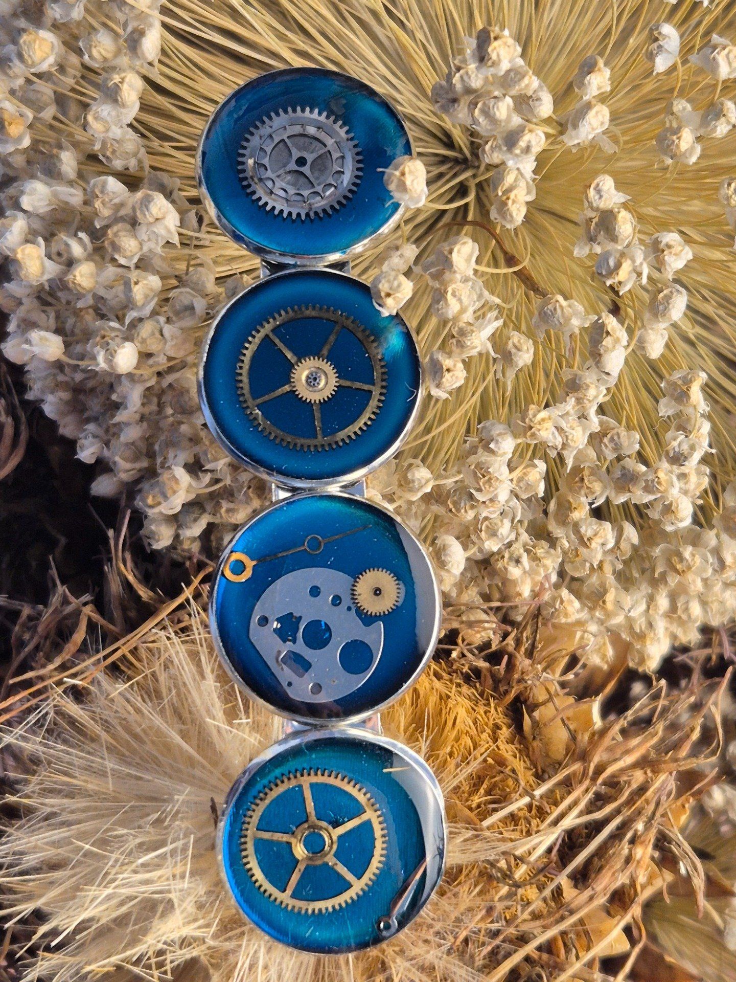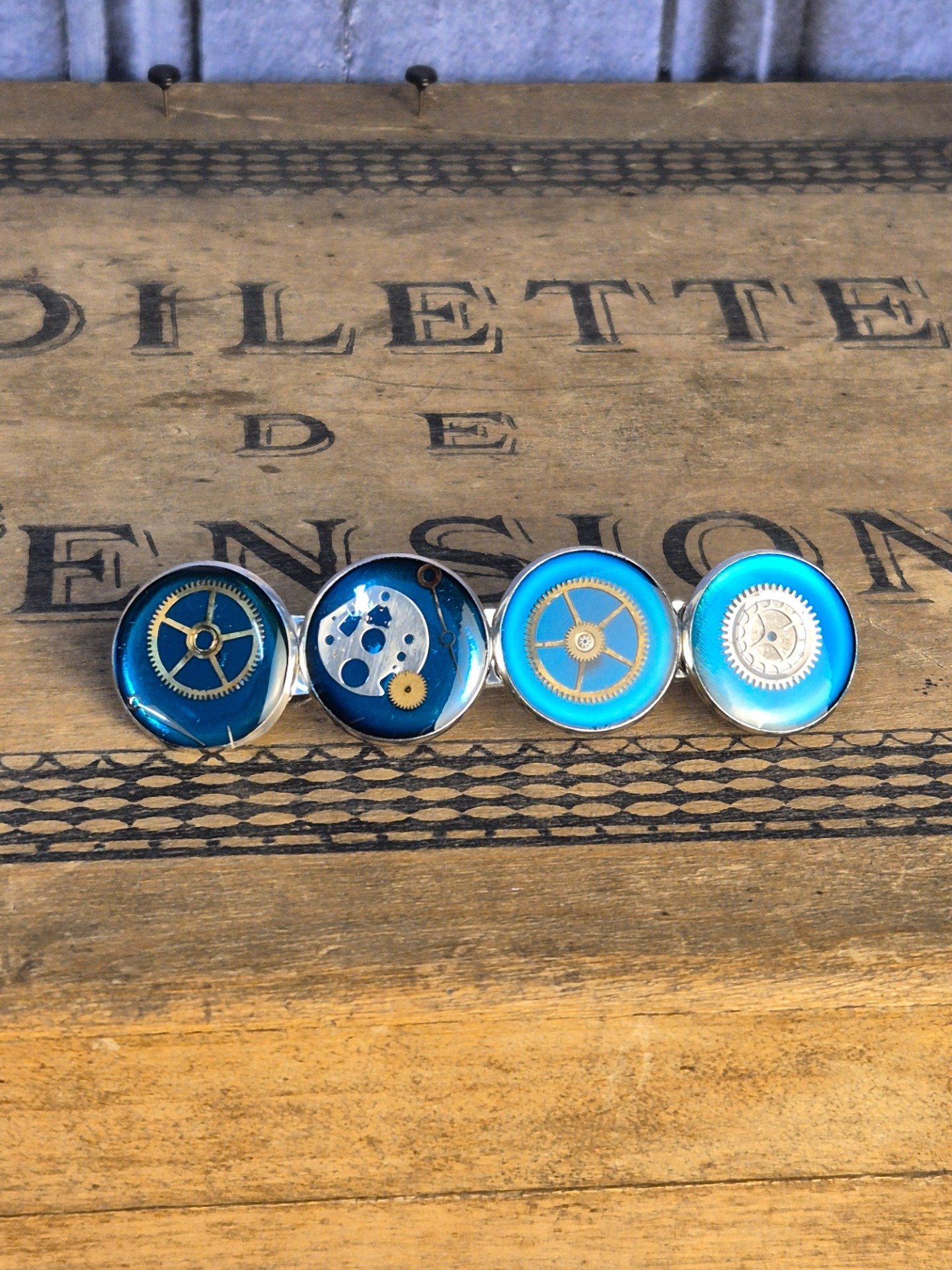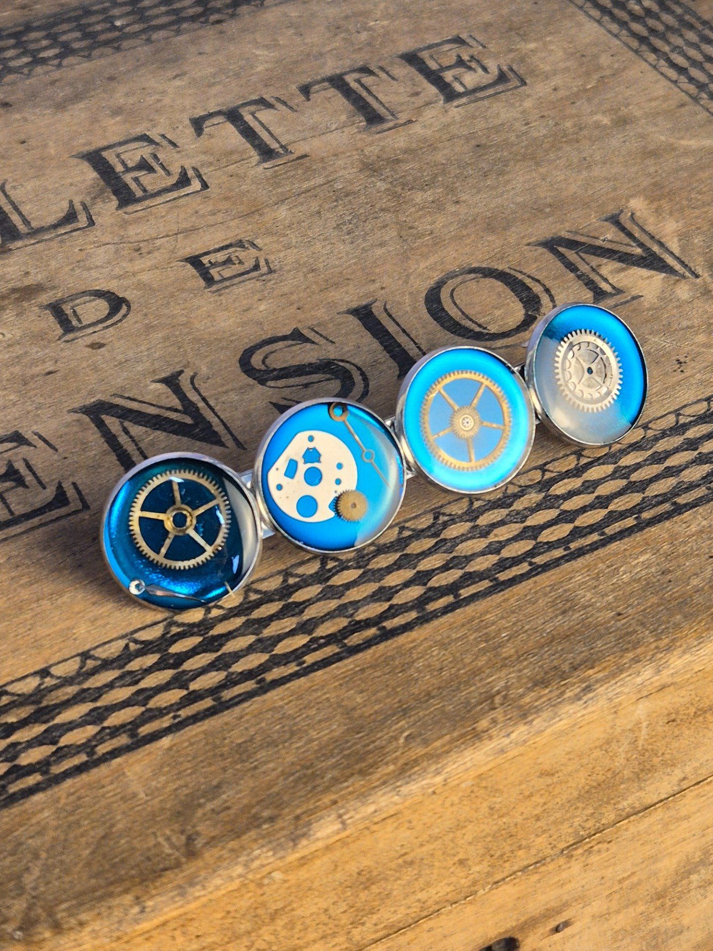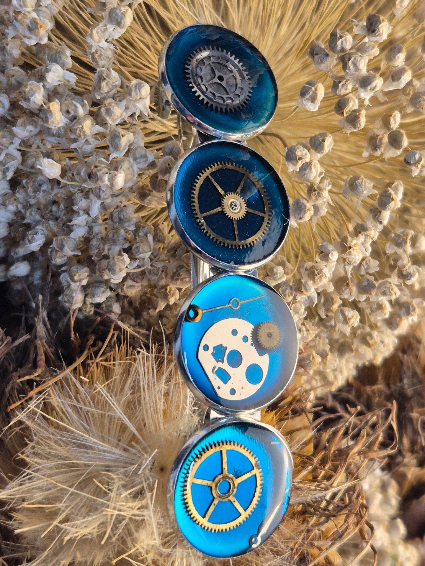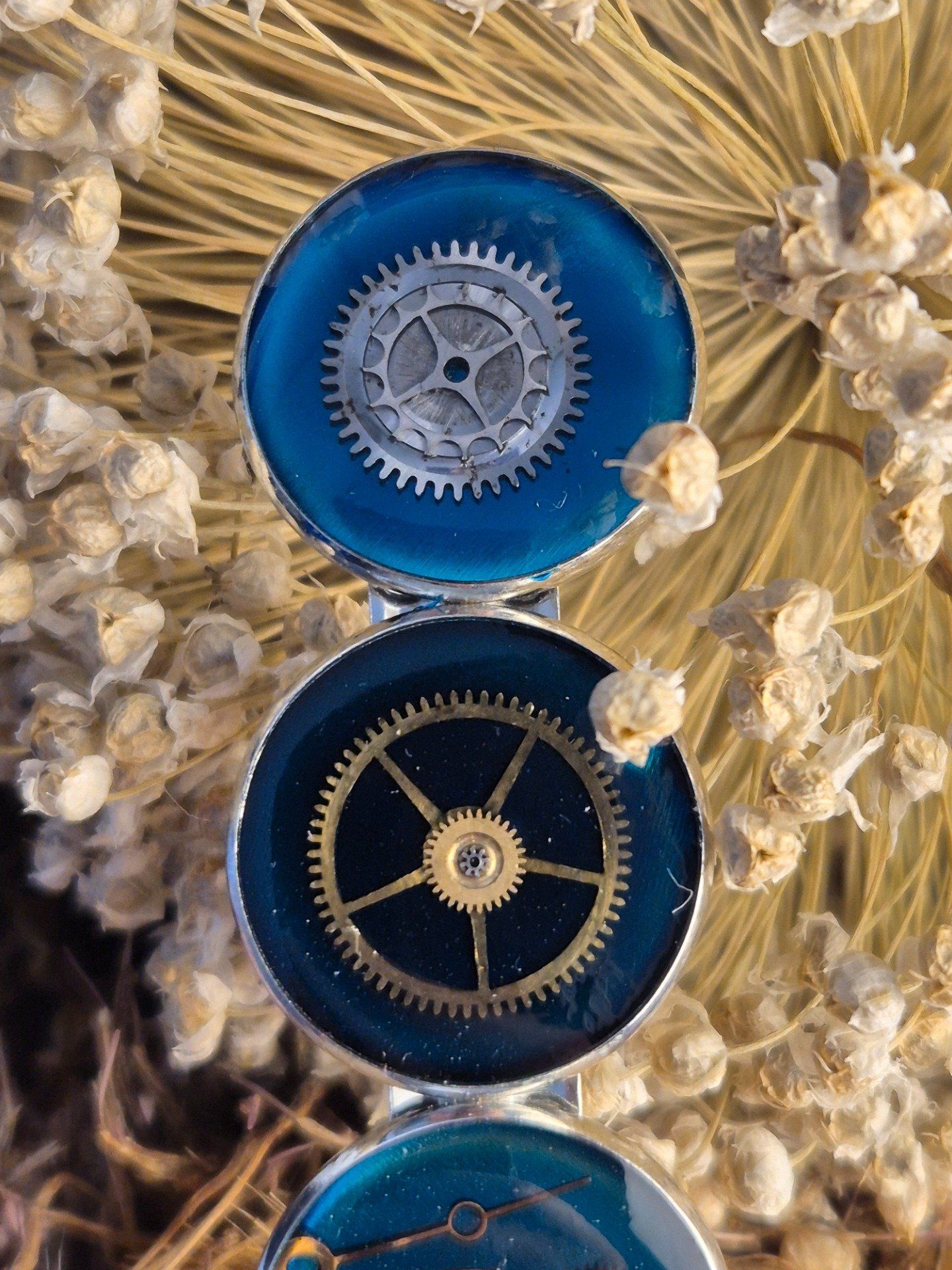 🌟 Chaque pièce est une fusion entre l'élégance et l'originalité : des cabochons peints à la main , parsemés quelquefois de quelques paillettes et sublimés par de véritables mécanismes de montres et/ou réveils .
