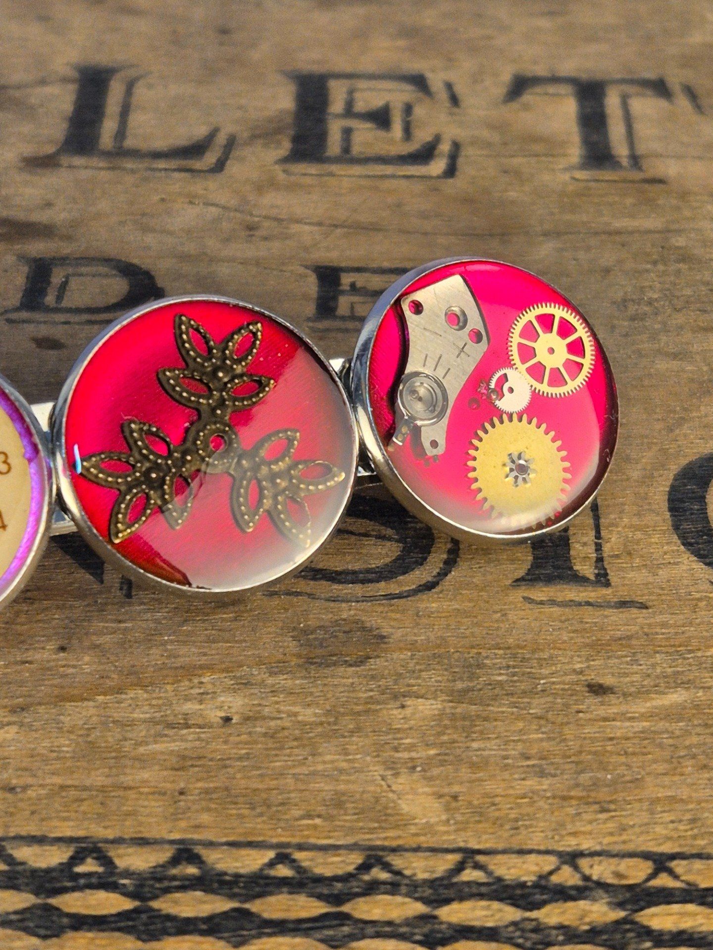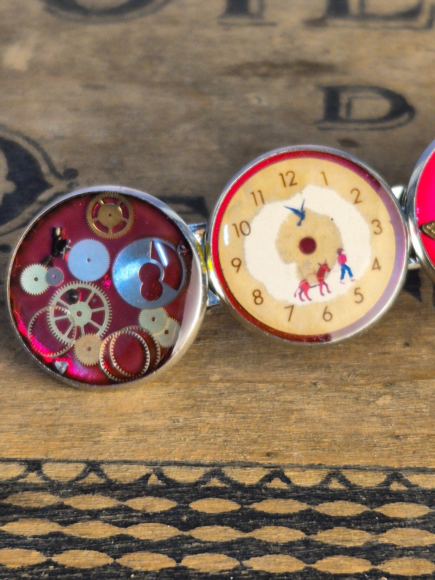 🌟 Chaque pièce est une fusion entre l'élégance et l'originalité : des cabochons peints à la main , parsemés quelquefois de quelques paillettes et sublimés par de véritables mécanismes de montres et/ou réveils .