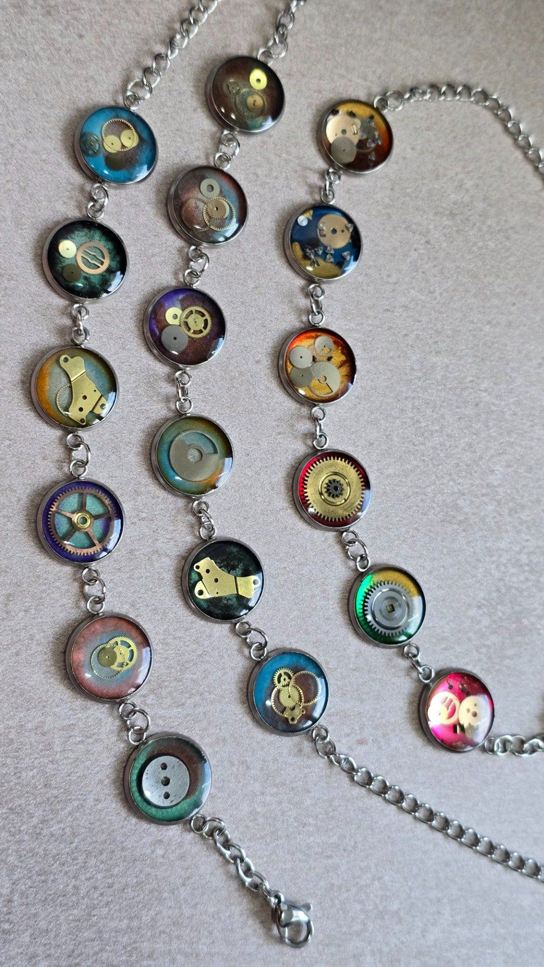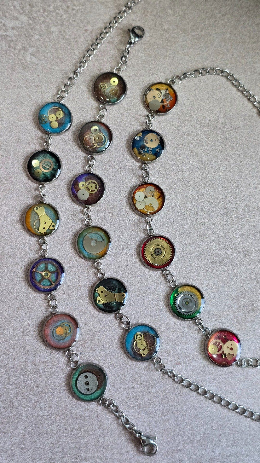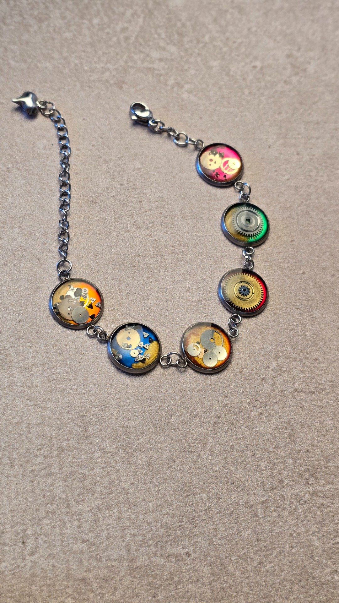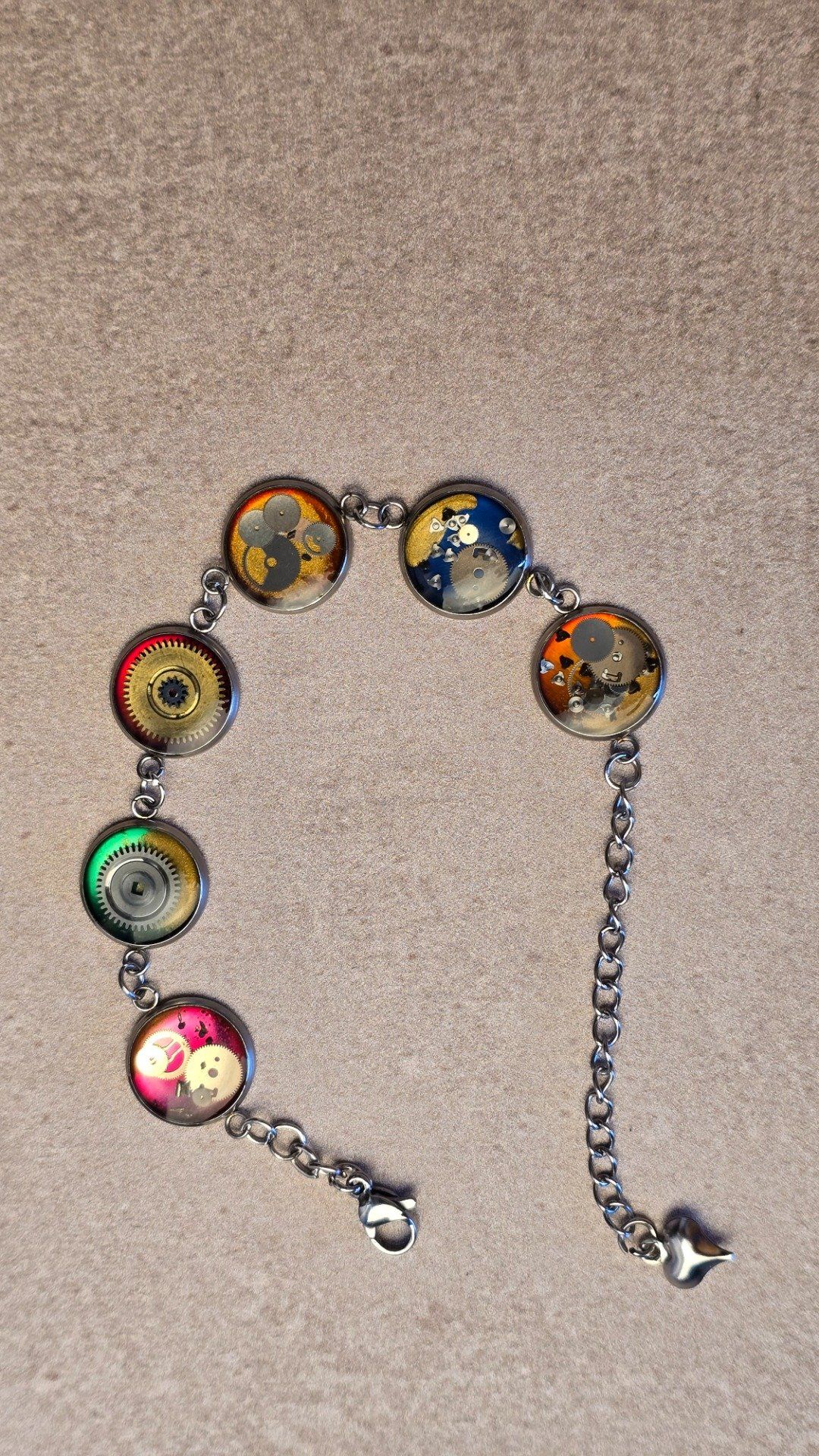 Bracelet steampunk multicolore réalisé à la main à partir de véritables mécanismes de montres anciennes recyclées, sertis sous résine. Une création artisanale unique, entre mémoire du temps et esthétique rétro-futuriste. (prix unitaire 32€)