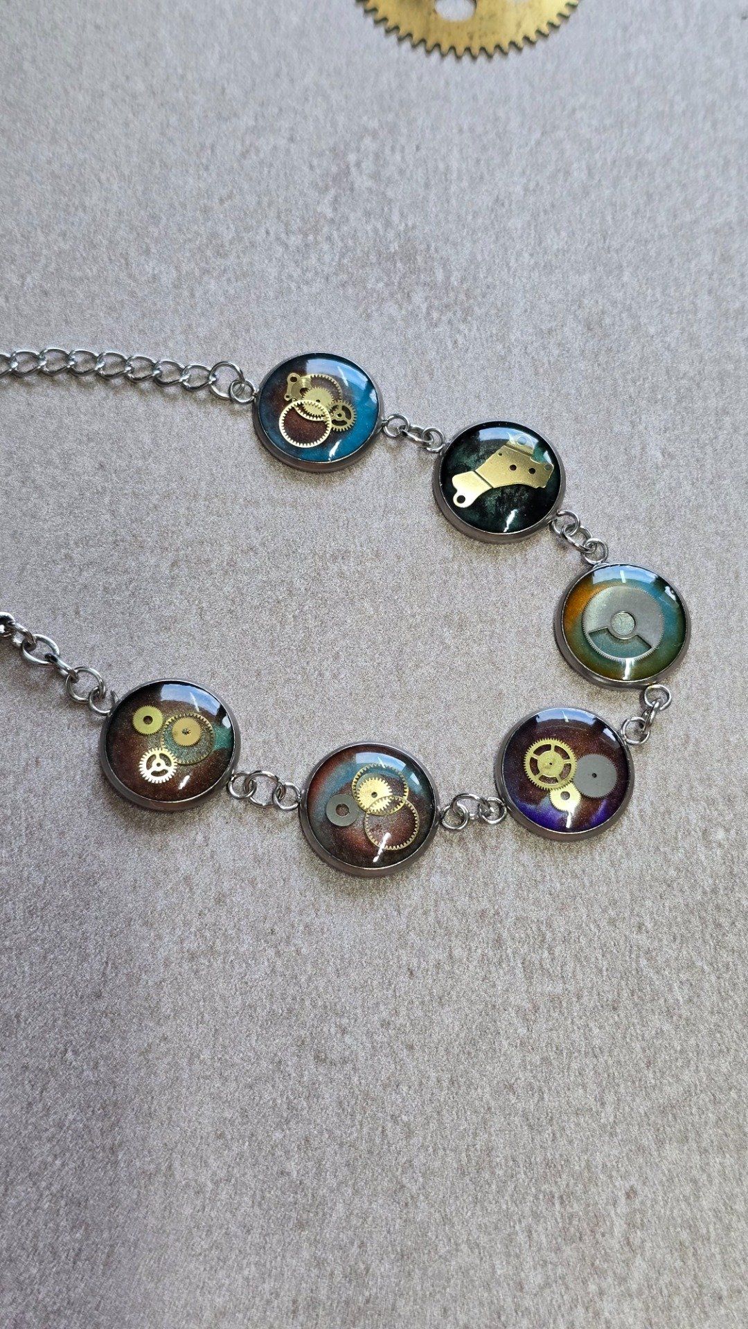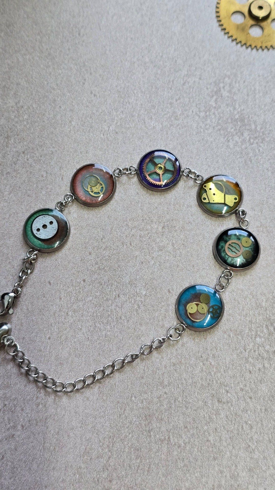 Chaque cabochon renferme un fragment du passé : des rouages chinés, démontés puis mis en valeur sous résine, transformant le temps en bijou à porter. Ce bracelet incarne l’esprit steampunk que j’explore à travers mes créations : un équilibre entre mécanique, poésie et réutilisation d’objets oubliés.