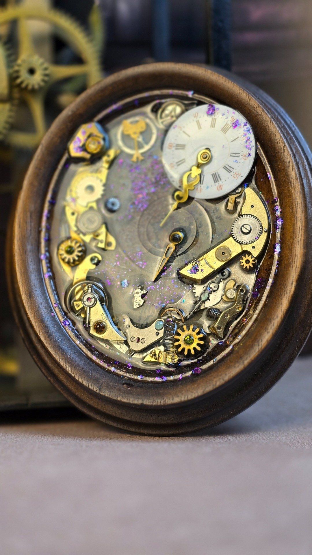 Un cadre unique mêlant cadran vintage de montre à gousset et bouquet de fleurs à deviner dans un univers steampunk chaleureux.