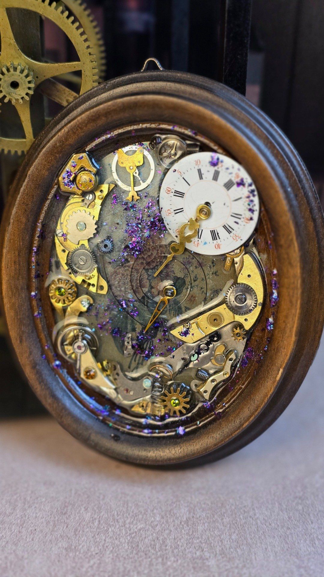 Ce cadre steampunk artisanal met en valeur un cadran vintage de montre à gousset. En regardant de plus près vous appercevrez le dessin initial du cadre, un joli bouquet de fleurs. Autour de lui, un ensemble de rouages et de pièces mécaniques recyclées s’entrelacent dans une composition riche et texturée. Le tout saupoudré de paillettes.