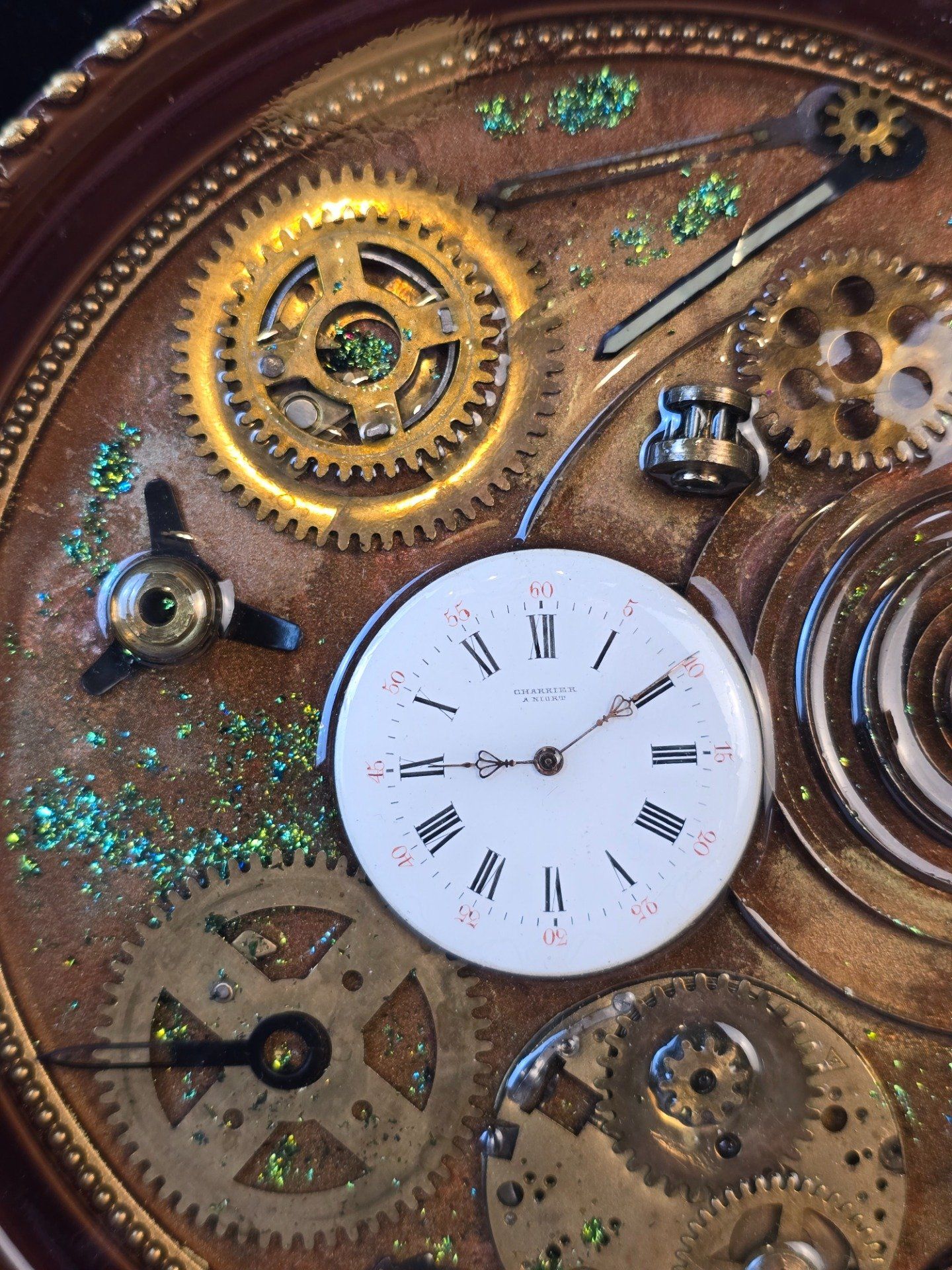 Un cadre artisanal unique mêlant mécanismes d’horlogerie recyclés avec des touches paillettes vertes