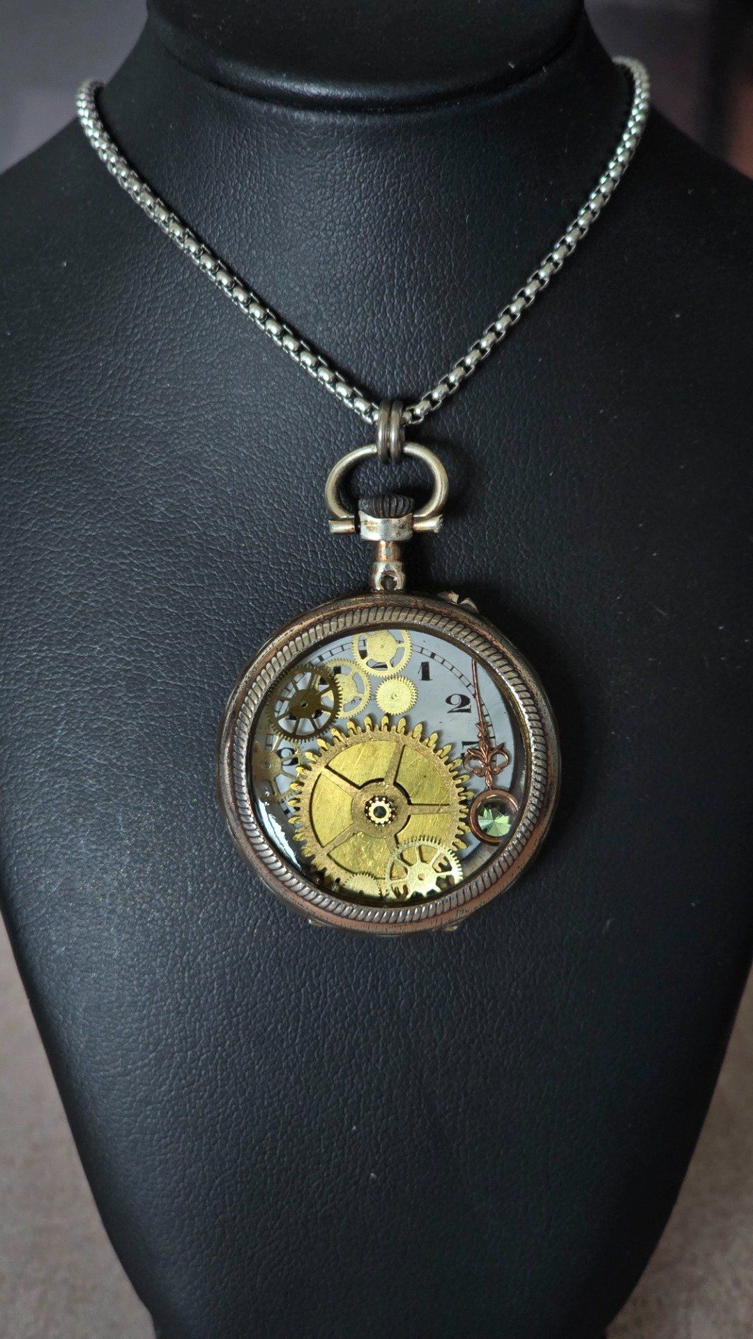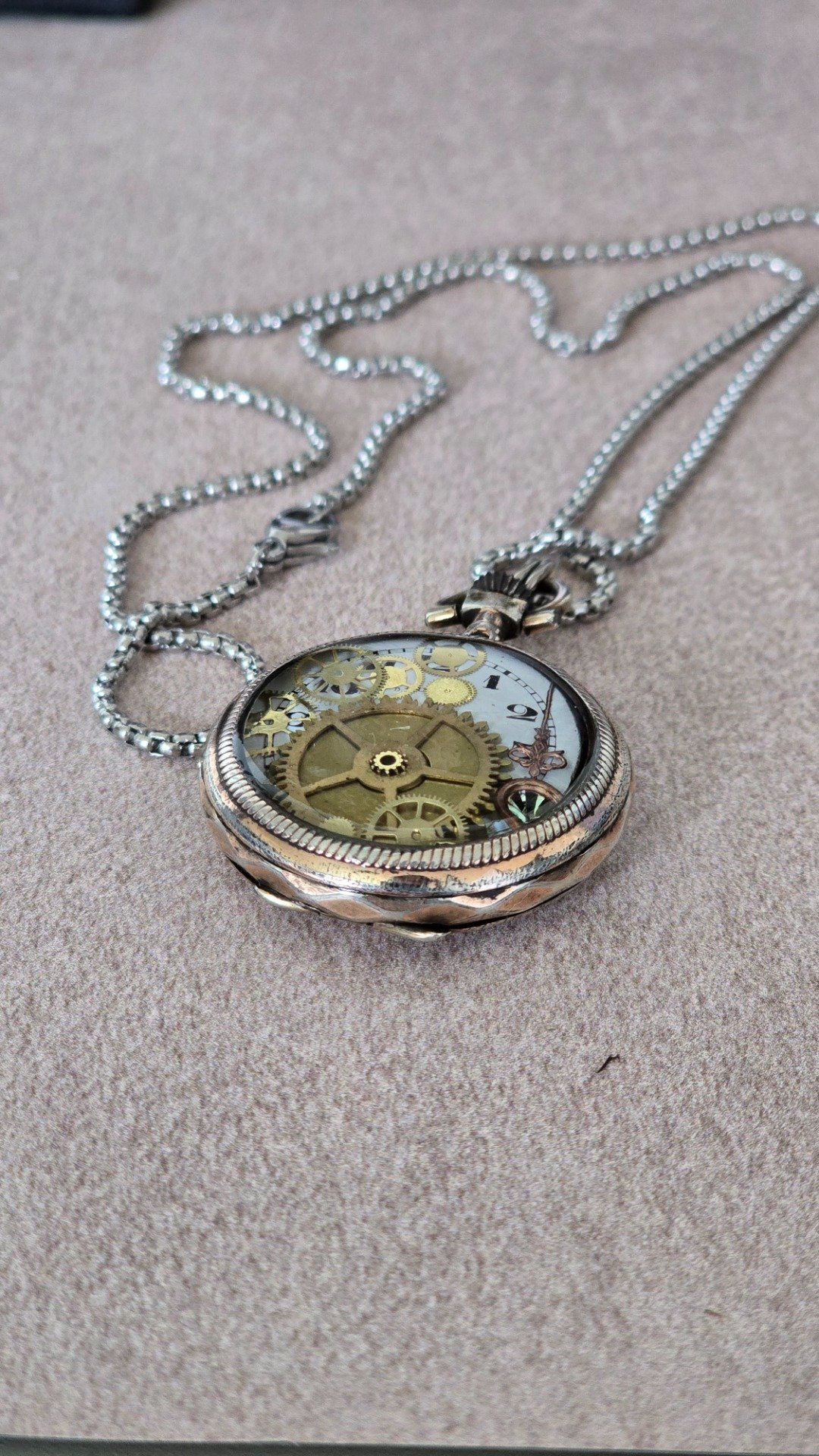 Montre à gousset steampunk recyclée, détournée en collier. Remplie de mécanismes de montres anciennes et figée sous résine, chaque pièce est unique et fabriquée à la main.