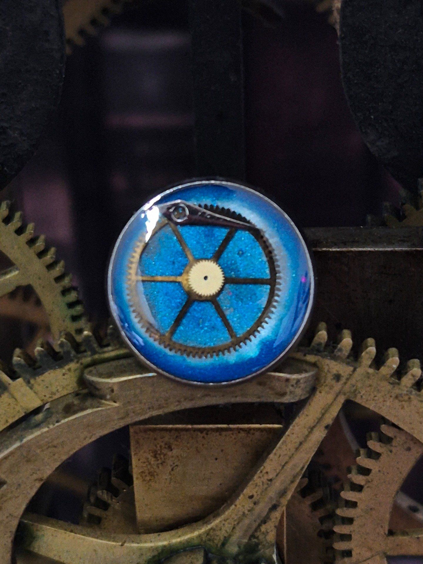 Pin’s bleu steampunk en acier coloré – Mécanismes de montres recyclés
