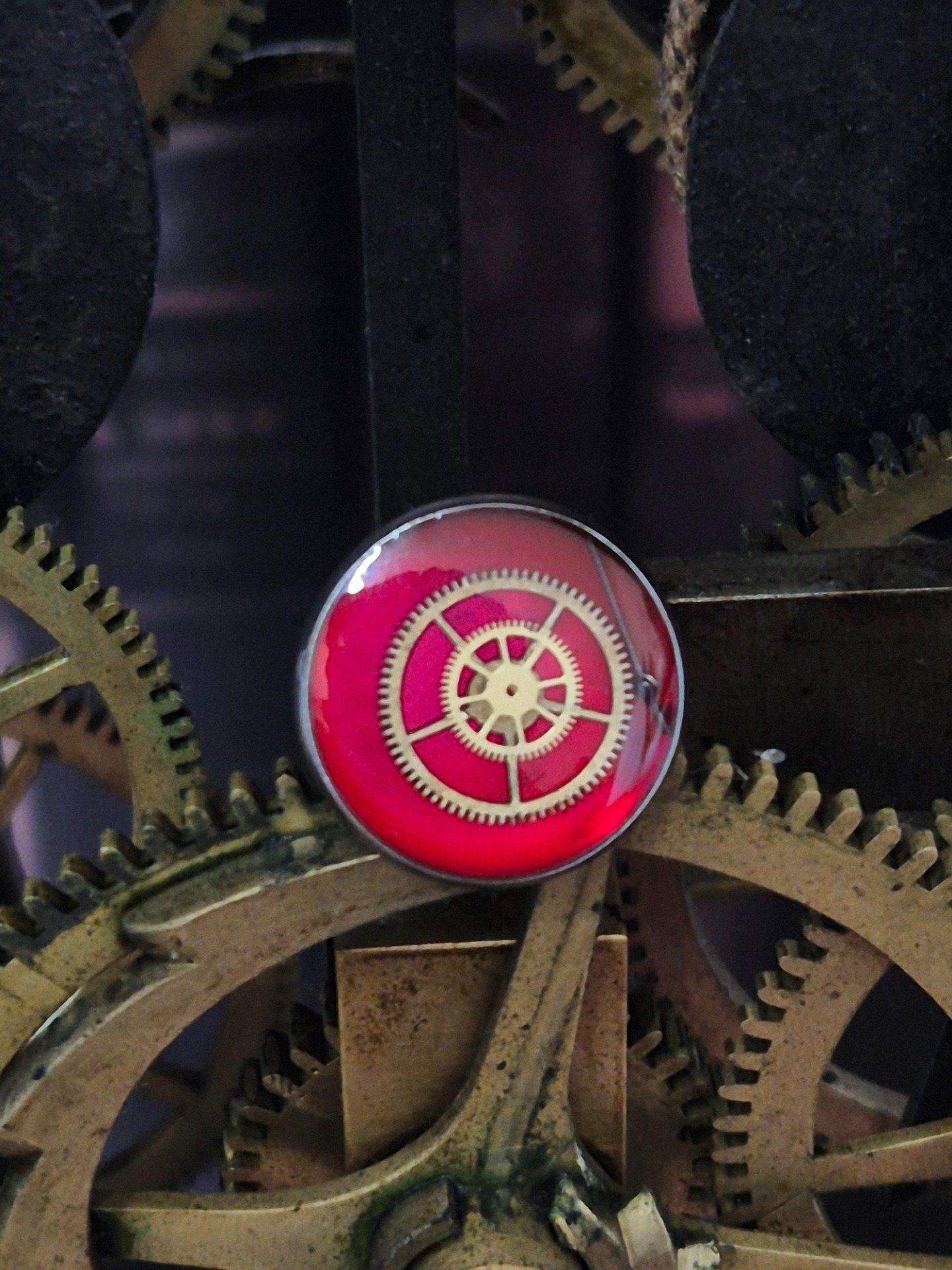 Ce pin’s steampunk en acier coloré (Ø 19,6 mm) est une petite pièce d’horlogerie transformée en accessoire plein de caractère.