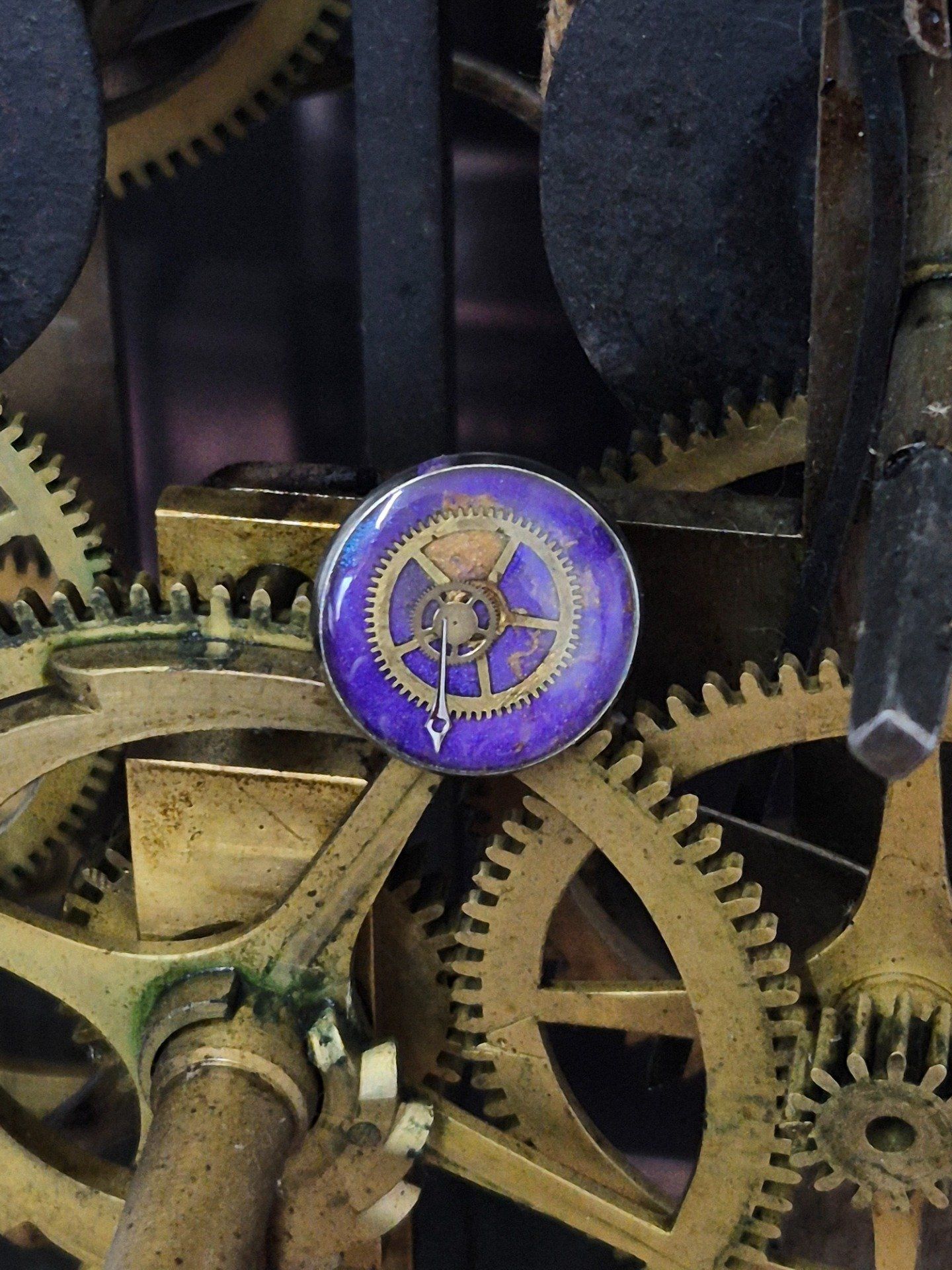 Pin’s violet steampunk en acier coloré – Mécanismes de montres recyclés
