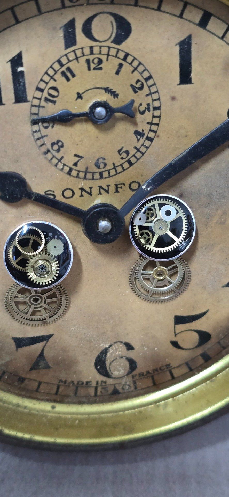 Chaque paire est réalisée à partir de véritables mouvements de montres à gousset anciennes, démontées à la main, puis mises en scène dans un cabochon rond de 12 mm peint en noir profond. Le contraste est volontaire : le noir absorbe le temps, les mécanismes le racontent.