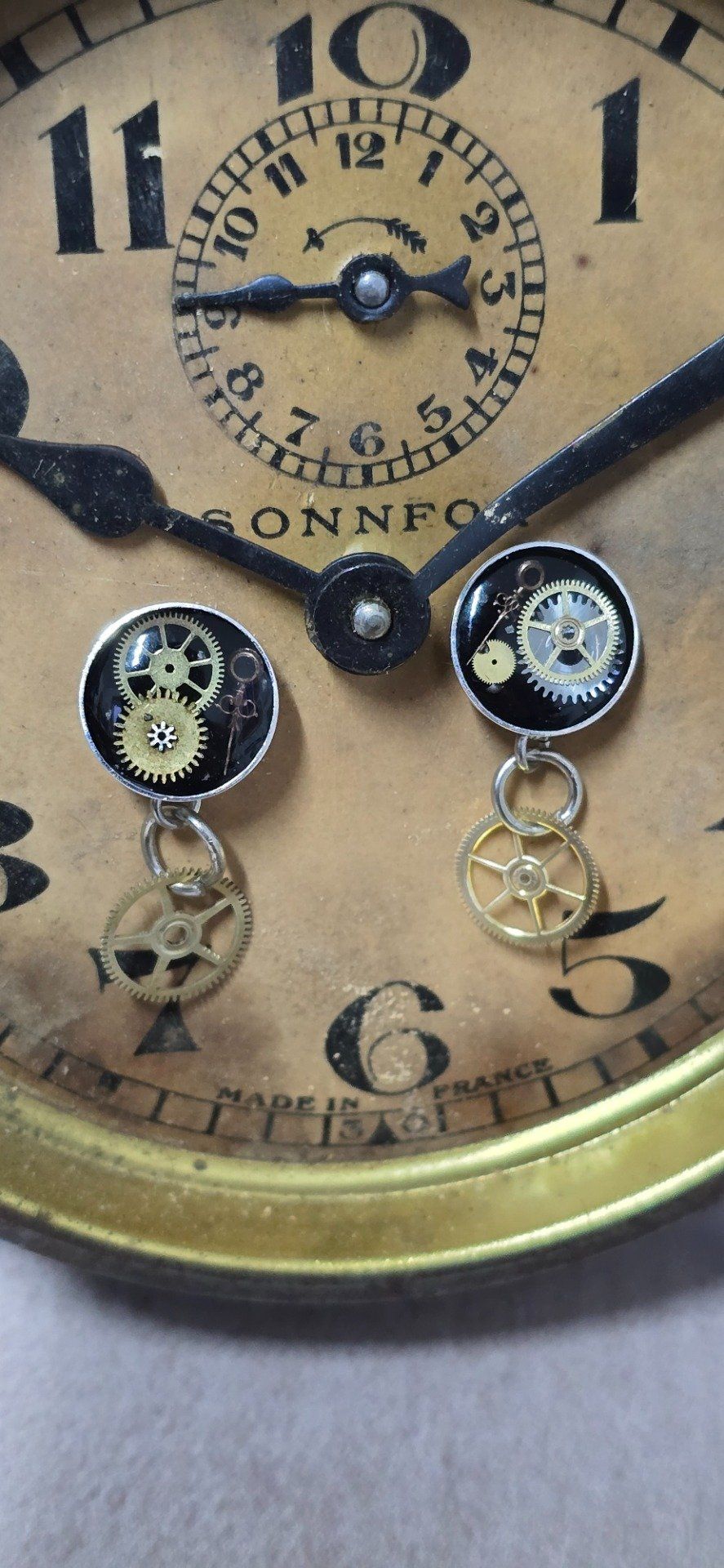 Chaque paire est réalisée à partir de véritables mouvements de montres à gousset anciennes, démontées à la main, puis mises en scène dans un cabochon rond de 12 mm peint en noir profond. Le contraste est volontaire : le noir absorbe le temps, les mécanismes le racontent.